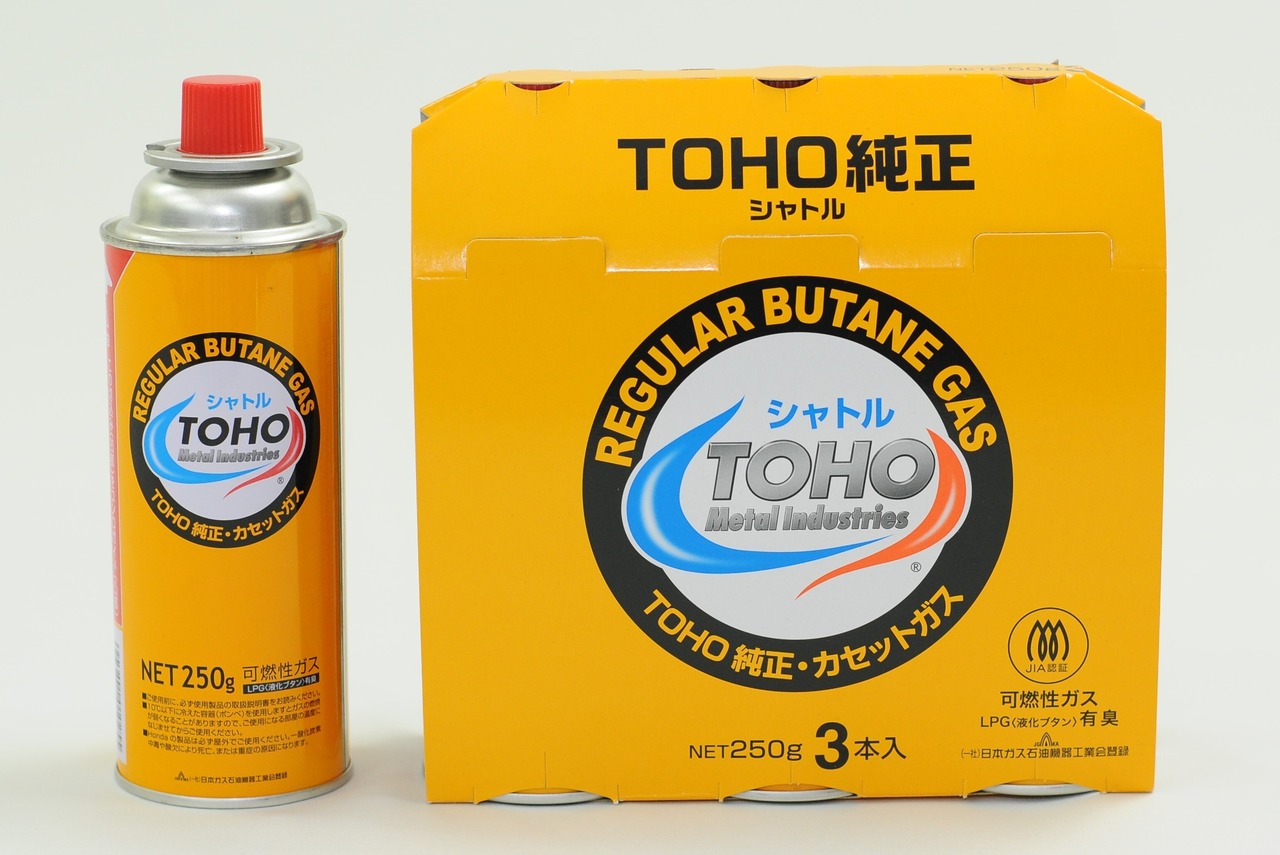(東邦金属工業株式会社と表示のあるカセットこんろ用ボンベ)